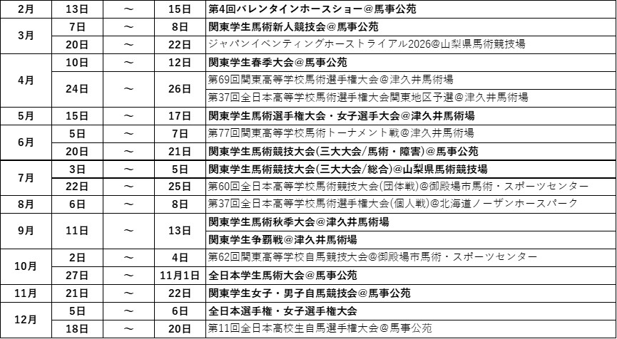 お知らせ申し上げます。 MIKI イベンティングフェスティバル September 2025@三木ホースランドパーク 令和7年度関東学生馬術秋季大会@津久井馬術場 ~運動選手推薦選考のお知らせ~ 令和7年度関東学生馬術競技大会@馬事公苑 チームポロシャツ購入について 2025年度 常磐松総会及び新入生歓迎会のご案内について 関東学生春季大会@馬事公苑 株式会社乗馬クラブクレインpresent's 2025TokyoイベンティングフェスティバルMarch@馬事公苑 第56回関東学生馬術新人競技大会 令和6年度第3回バレンタインホースショー@馬事公苑 令和6年度関東学生馬術争覇戦@馬事公苑 第96回全日本学生馬術選手権大会 令和6年度 引継式のご案内について 第9回関東学生馬術男子競技大会 全日本学生馬術大会2024@馬事公苑 第60回関東高等学校自馬競技大会@馬事公苑 小淵沢トライアル2024@山梨県馬術競技場 令和6年度関東学生馬術秋季大会@馬事公苑 令和6年度関東学生馬術競技大会@馬事公苑 株式会社乗馬クラブクレインpresent's TOKYOイベンティングフェスティバルJune2024@馬事公苑 ~運動選手推薦選考のお知らせ~ 第75回関東高等学校馬術トーナメント戦@馬事公苑 2024年度 常磐松総会及び新入生歓迎会のご案内について 第96回関東学生馬術選手権大会 第51回東京都馬術大会@馬事公苑 第61回東都学生馬術競技大会@馬事公苑 株式会社乗馬クラブクレインpresent'sTOKYOイベンティングフェスティバルAplil2024@馬事公苑 令和5年度第2回バレンタインホースショー@津久井馬術競技場 第55回関東学生馬術新人競技大会 第95回全日本学生馬術選手権大会 第8回関東学生馬術男子競技大会 令和5年度 引継式のご案内について 全日本学生馬術大会 株式会社乗馬クラブクレインpresen's 総合馬術ホーストライアルシリーズ2023 令和5年度関東学生馬術争覇戦 ~運動選手推薦選考のお知らせ~ 令和5年度関東学生馬術競技大会 第95回関東学生馬術選手権大会 第1回関東学生ゴールデンホースショー 第60回東都学生馬術大会 第43回スクーリング馬術大会 第75回東京六大学馬術競技大会 令和4年度第54回関東学生馬術新人競技大会 第7回関東学生馬術男子競技大会 全日本学生馬術大会 管清工業presents総合馬術ホーストライアルシリーズ2022(9月) 令和4年度全日本学生馬術選手権大会 令和4年度関東学生馬術争覇戦 令和4年度関東学生馬術競技大会の写真をアップいたしました → 写真を見る